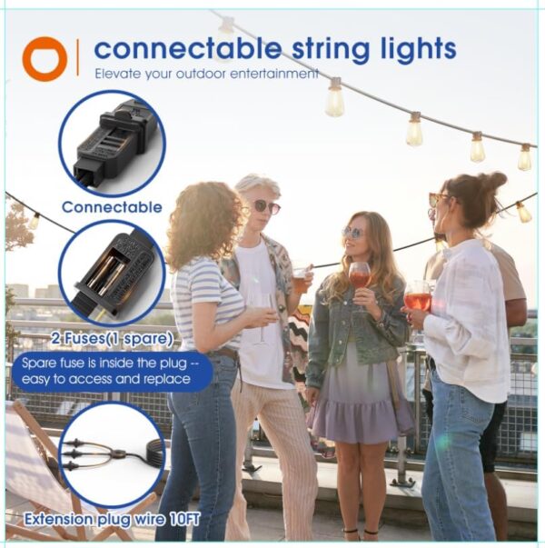 The 100FT (2x50FT) patio lights connect end‑to‑end, allowing you to link up to 28 strands of 50FT lights for large‑scale illumination. Perfect for patios, backyards, bistros, gardens, gazebos, weddings, birthdays, and more. Transform any occasion into a dazzling escape.