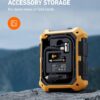 Automatically stops when the preset pressure is reached. Built‑in rear storage compartment keeps accessories organized and portable.