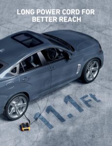 Totale snoerlengte van 3,4 meter maakt het eenvoudig om alle vier de banden te bereiken. Compact ontwerp past gemakkelijk in het voertuig voor noodsituaties.