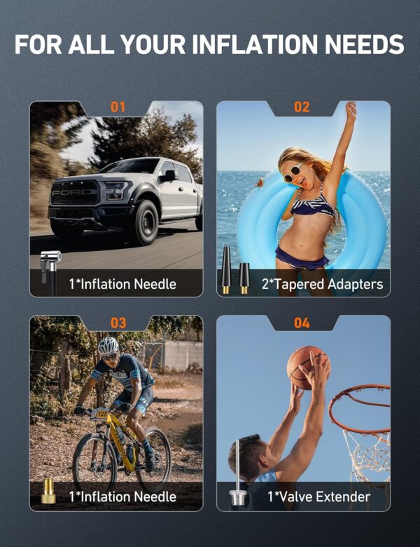 Wordt geleverd met 3 nozzles en 1 extra zekering. Geschikt voor autobanden, SUV banden, motorfietsen, fietsen, sportballen en meer.