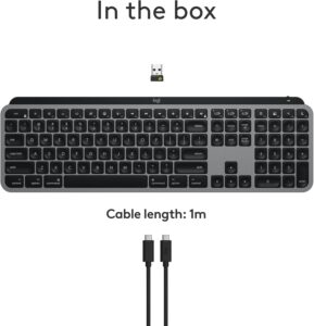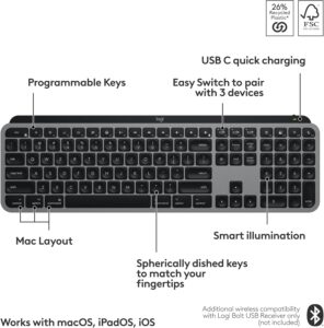 Features a Mac key layout, USB‑C charging, and Logi Options+ functions for macOS. Perfectly complements MacBook Pro, MacBook Air, iMac, and iPad.