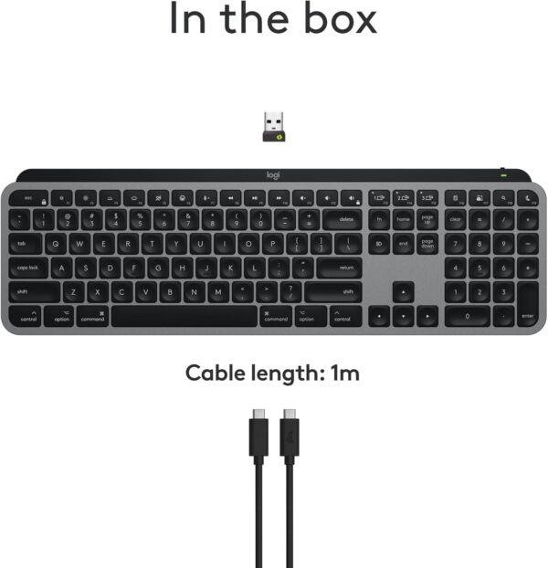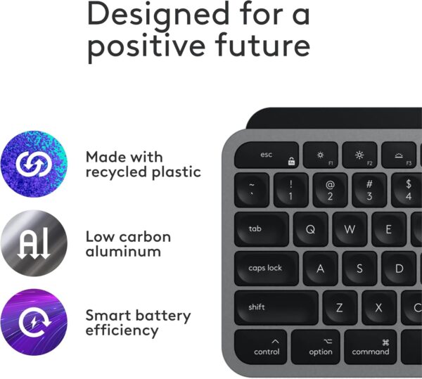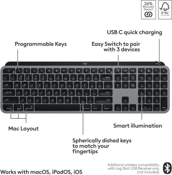 Optimized for macOS and iPadOS, the MX Keys S for Mac delivers fluid, precise typing with a Mac‑specific key layout and Apple‑matching finishes in Space Grey. Designed to blend seamlessly into your Apple setup, this keyboard combines performance, comfort, and sustainability.